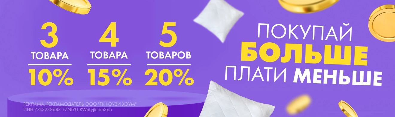 Скидка автоматически рассчитывается в корзине на сайте cozyhome.ru в зависимости от количества товара, добавленного в корзину - при покупке 3 товаров скидка 10%, при покупке 4 товаров скидка 15%, при покупке 5 и более товаров скидка 20%