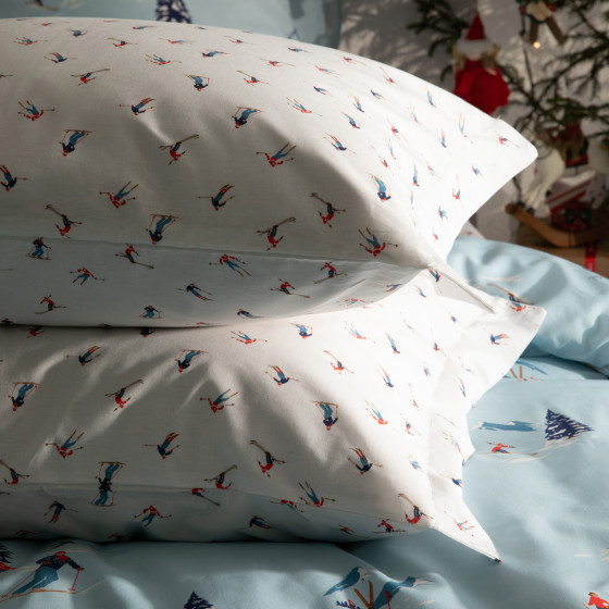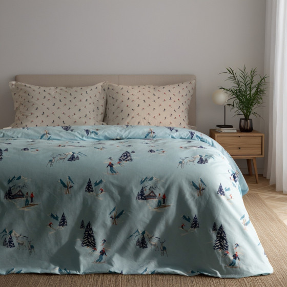 Каждый предмет коллекции отличается тщательной проработкой деталей — от точной передачи горных пейзажей на постельном белье до стилизованных изображений лыжников на одежде.